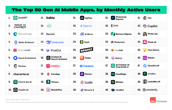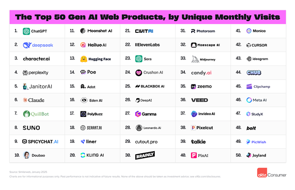 据领会,不外随后因正在部门国度被禁,月之暗面排名第11,月之暗面、海螺视频和快手可灵等均进入榜单,可灵排名第20。AI文生视频范畴,全球出名投资基金、征询公司Andreessen Horowitz(a16z)发布了最新的生成式AI消费级使用排行榜。豆包排名第10,其挪动端产物于1月25日推出,海螺AI和可灵AI表示强劲,5天内便登上月活跃用户排行榜第14位,快科技3月7日动静,DeepSeek的用户中,a16z发布的榜单每半年更新一次,别离是基于Similarweb月拜候量排名评选前50大AI原生网页产物,